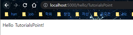 - 해당 python script를 저장하고 실행시킨 후 http://localhost:5000/hello/TutorialsPoint로 접속하면 다음과 같음