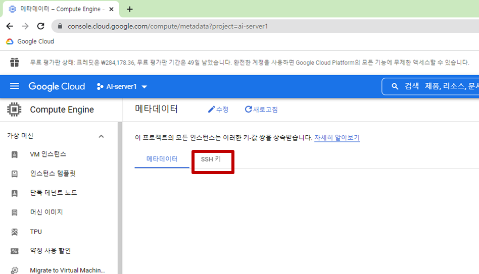 2. GCP matadata에 SSH 키 입력
