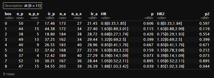 dt_return <- data.table(hos,n_p,n_p_e,ir_p,n_a,n_a_e,ir_a,HR,p,HR2,p2)
