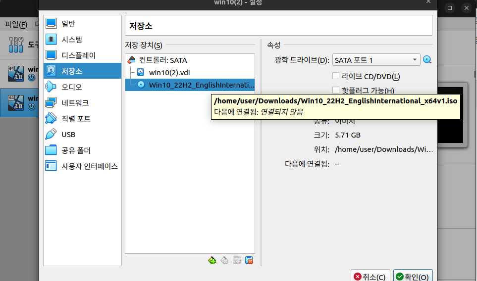 - 윈도우 설치 완료 후 > 디스크 설정에서 광학디스크 연결 삭제