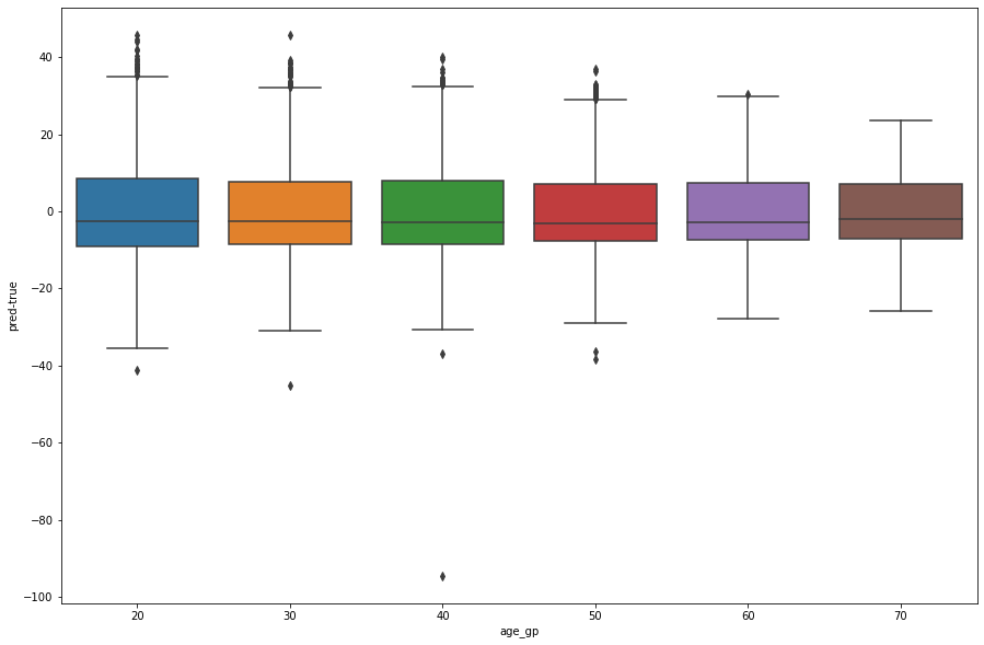 sns.boxplot(y='pred-true', x='age_gp', data=df_age_error)