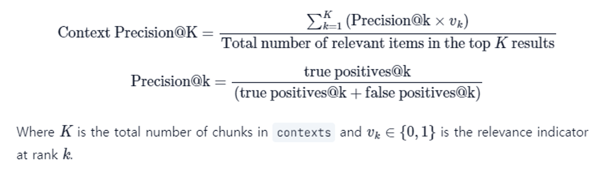 - $$ \text{문맥 정밀도@K} = \frac{\sum_{k=1}^{K} \left( \text{정밀도@k} \times v_k \right)}{\ 상위 K 결과에서의 관련 항목 수} $$