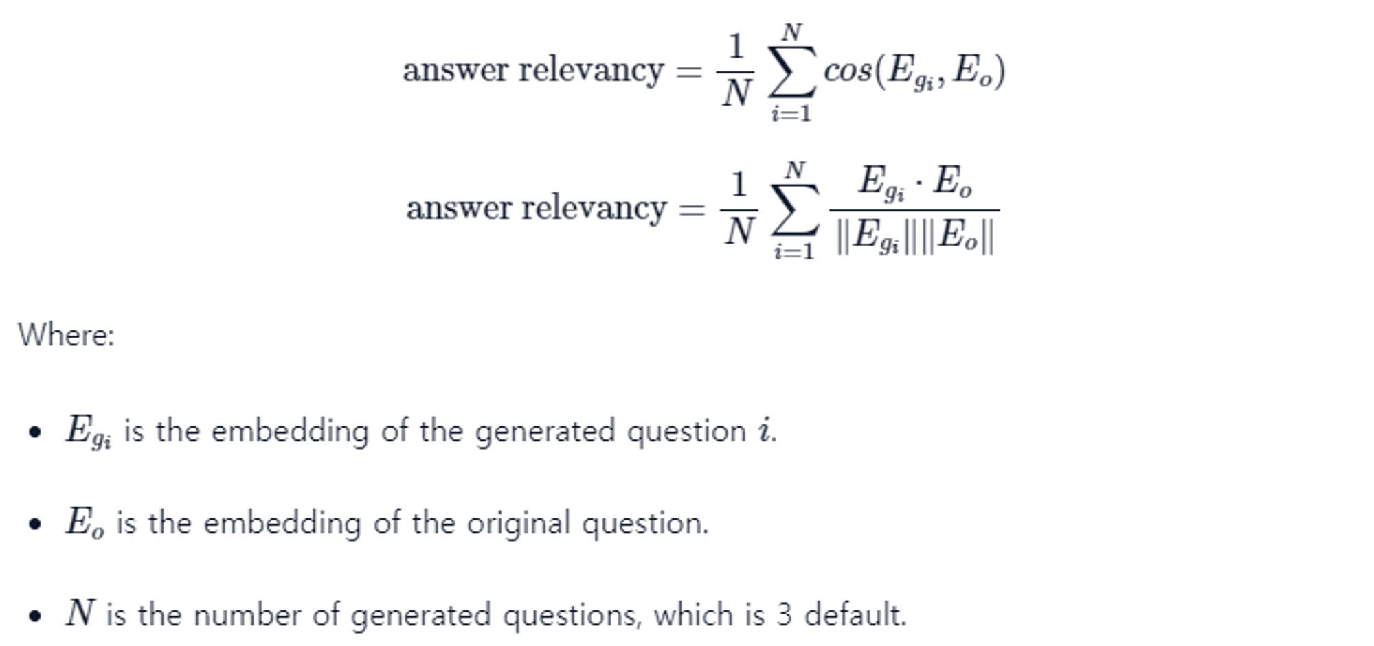 - $$ \\text{답변 적합성} = \\frac{1}{N} \\sum_{i=1}^{N} \\cos(E_{g_i}, E_o) $$