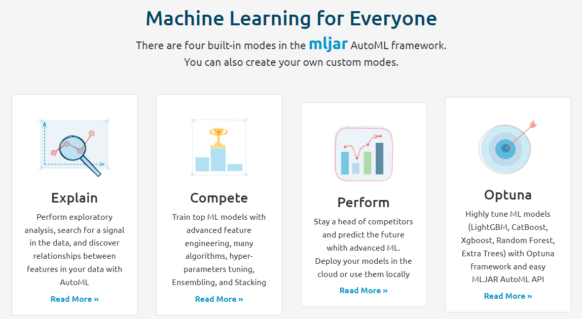 AutoML Modes Built-in modes There are 3 built-in modes available in AutoML: Explain - to be used when the user wants to explain and understand the data. Perform - to be used when the user wants to train a model that will be used in real-life use cases. Com