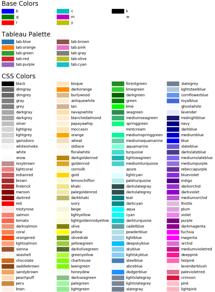 reference: https://matplotlib.org/3.1.0/gallery/color/named_colors.html