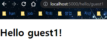 - route() decorator에 <name> 추가, http://localhost:5000/hello/TutorialsPoint로 접속하면 'TutotialsPoint'는 hello()의 argument로 쓰임